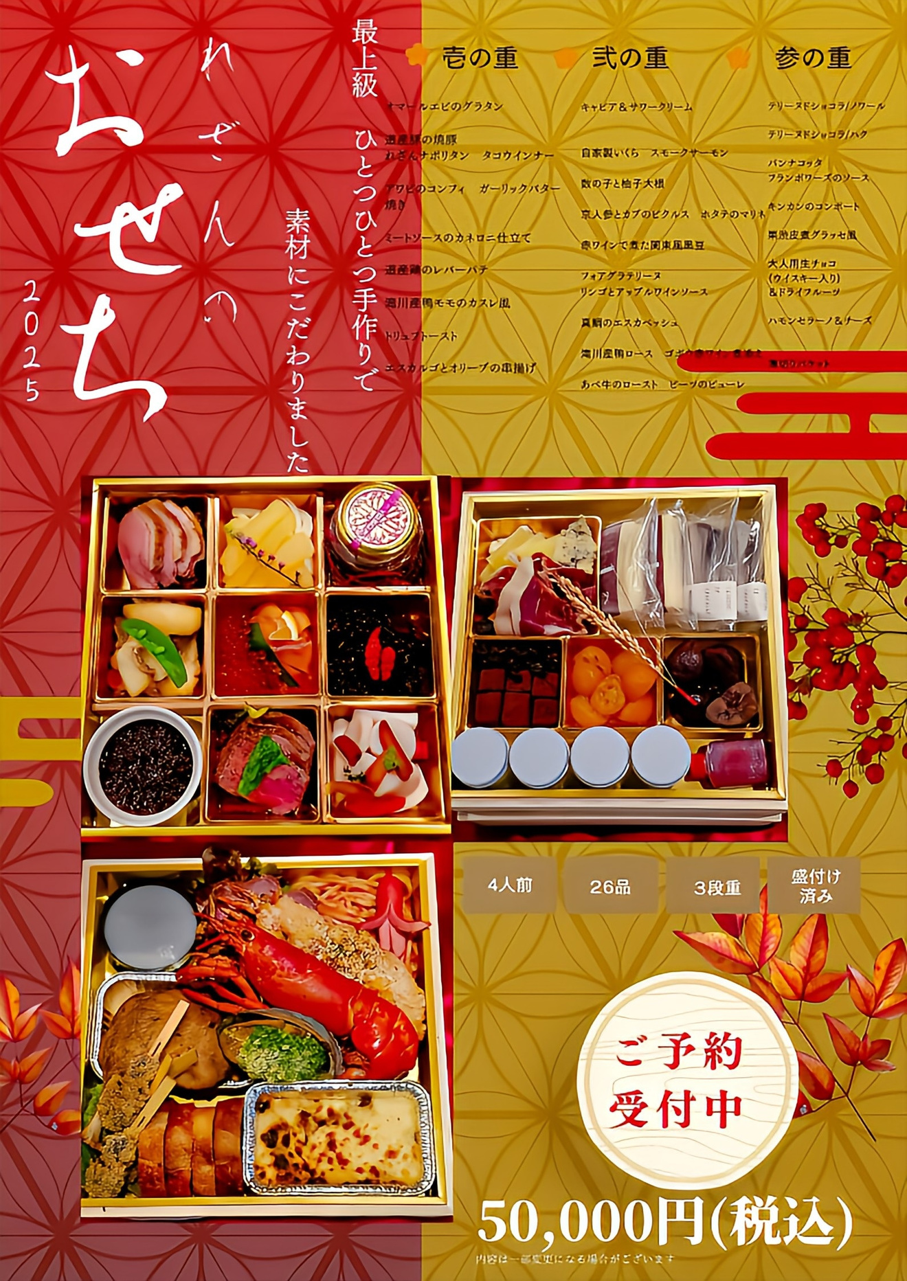 キャビア一瓶やオマール海老等etc…お重が重たいと毎年好評のクレーム頂いております!